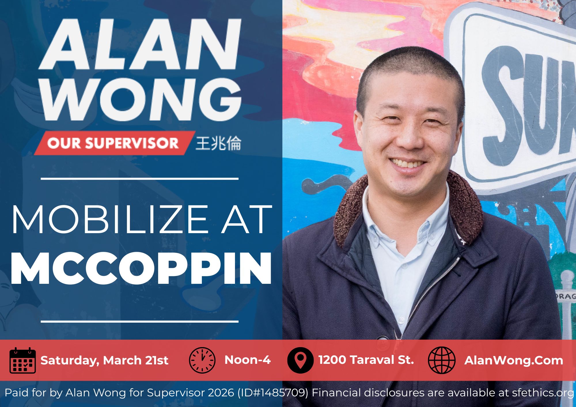 Join us at McCoppin Square Park as we hit the streets together! Meet Supervisor Alan Wong, connect with fellow supporters, and knock on doors to listen to our neighbors, build momentum, and turn out the vote!